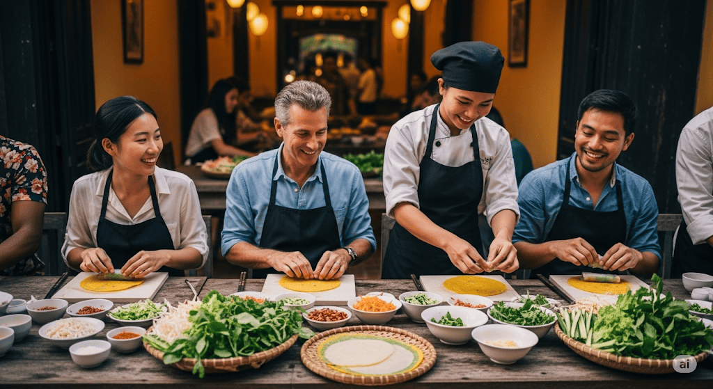 • Almuerzo y Diversión Local (12:00 PM – 3:00 PM): Date un festín con algunos de los platos legendarios de Hoi An. Luego, elige tu aventura: pringarte las manos en una clase de cocina en Hoi An, o dar vueltas como una loca en una barca de cesto. Ambas son ridículamente divertidas.