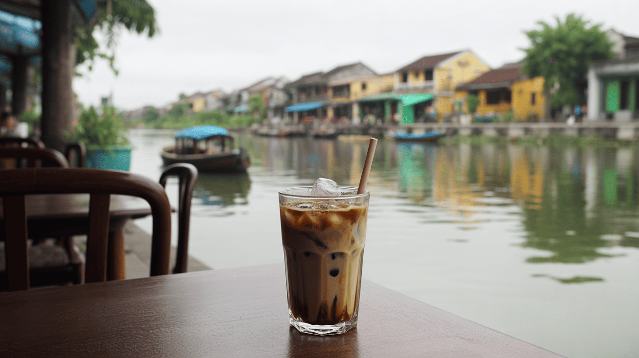 A media tarde, el sol puede ser bastante intenso y, sinceramente, siempre se agradece un descanso. Hoi An está prácticamente diseñada para relajarse en hermosos cafés. Encontré un lugar perfecto justo al lado del río Thu Bon, con un balcón con vistas al agua. Pedí un cà phê sữa đá (café helado vietnamita con leche condensada) – es dulce, fuerte y justo lo que necesitaba para recargar energías.