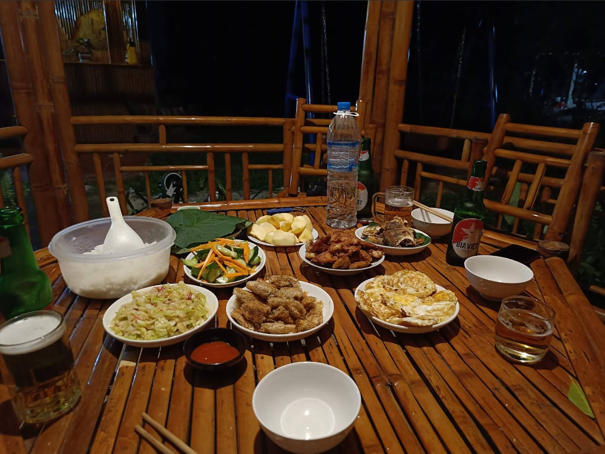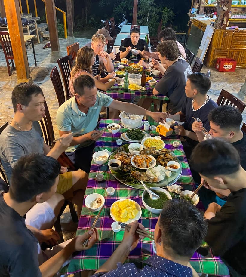 就是这个。这就是你来这里的全部意义。与完全陌生的人分享一顿饭,喝得酩酊大醉,这种体验比任何观景台都更难忘。这就是河江民宿体验