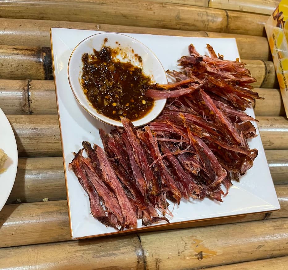 我第一次吃的时候,不知道该拿它怎么办。但后来你看到当地人把它拌进汤里,或者用它来吸收菜肴的汤汁。这是纯粹的、质朴的能量来源。这个,再加上Thit Trau Gac Bep(熏水牛肉干),才是山区的真正味道。这种牛肉干有嚼劲、辣、烟熏味十足……配上一杯冰啤酒(如果你找得到的话)就完美了。